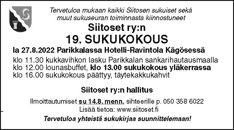 Ilmoittautumiset sukutapaamiseen viimeistään 21.7. sähköpostiin: jouko.siitonen@pp.inet.fi. puh.