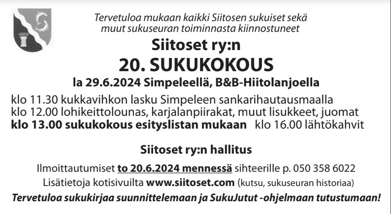 Siitoset ry:n sukukokous pidettiin Hiitolanjoella 29.6.2024. Sukukokoukseen osallistui 65 henkilöä, heistä perustajajäseniä paikalla oli 8 henkilöä. Vuoden 2024 kunniajäseneksi valittiin Kerttu Lindén Parikkalasta ja Rauno Norkia Ruokolahdelta. Edelliset 2022 vuoden kunniajäsenet Raija ja Aimo Paakkunainen olivat mukana myös kesän 2024 sukutapaamisessa. Sukukokouksessa puheenjohtaja Jouko Siitonen ehdotti, että isovanhemmat/ vanhemmat hankkisivat sukukirjan jälkipolvilleen.